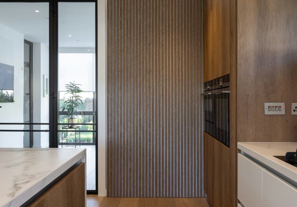 Aportamos textura y calidez con revestimiento de paredes con lamas de madera.
